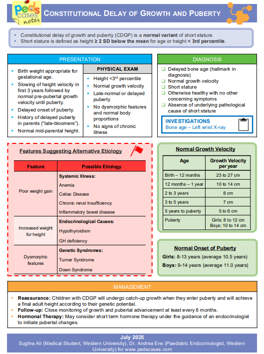This PedsCases Note provides a one-page infographic on Constitutional Delay of Growth and Puberty. This is a normal variant of short stature and will discuss the diagnosis and management. It was created by Sughra Ali (Medical Student, Western University) with the help of Dr. Andrea Ens (Paediatric Endocrinologist, Western University)