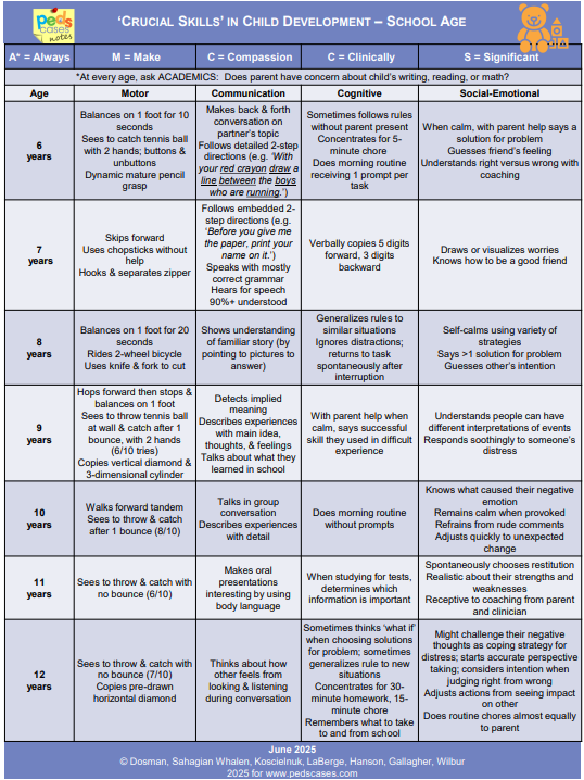 This PedsCases note provides the most updated developmental milestones chart for school age children. The following resource was developed by Dr. Cara Dosman, a Developmental Pediatrician at the University of Alberta, with local and national colleagues.