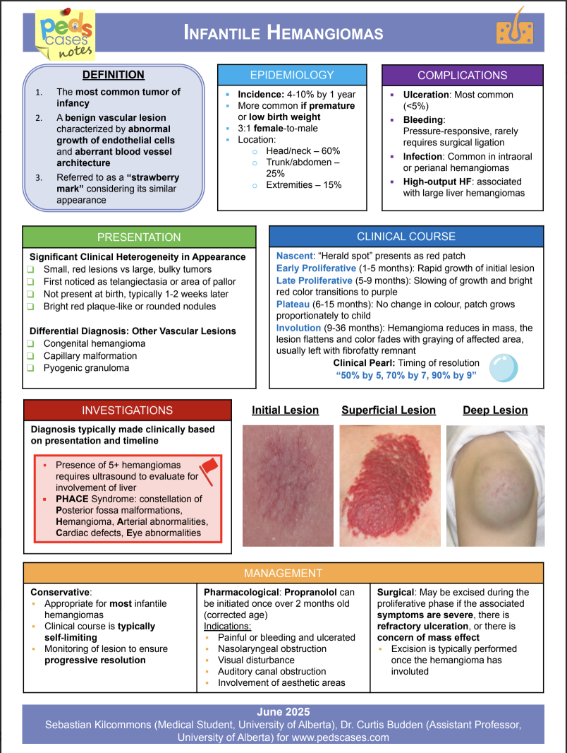 This PedsCases Note provides a one-page infographic on infantile hemangiomas which is the most common tumour of infancy. It was created by Sebastian Kilcommons (Medical Student, University of Alberta) with the help of Dr. Curtis Budden (Assistant Professor, University of Alberta).
