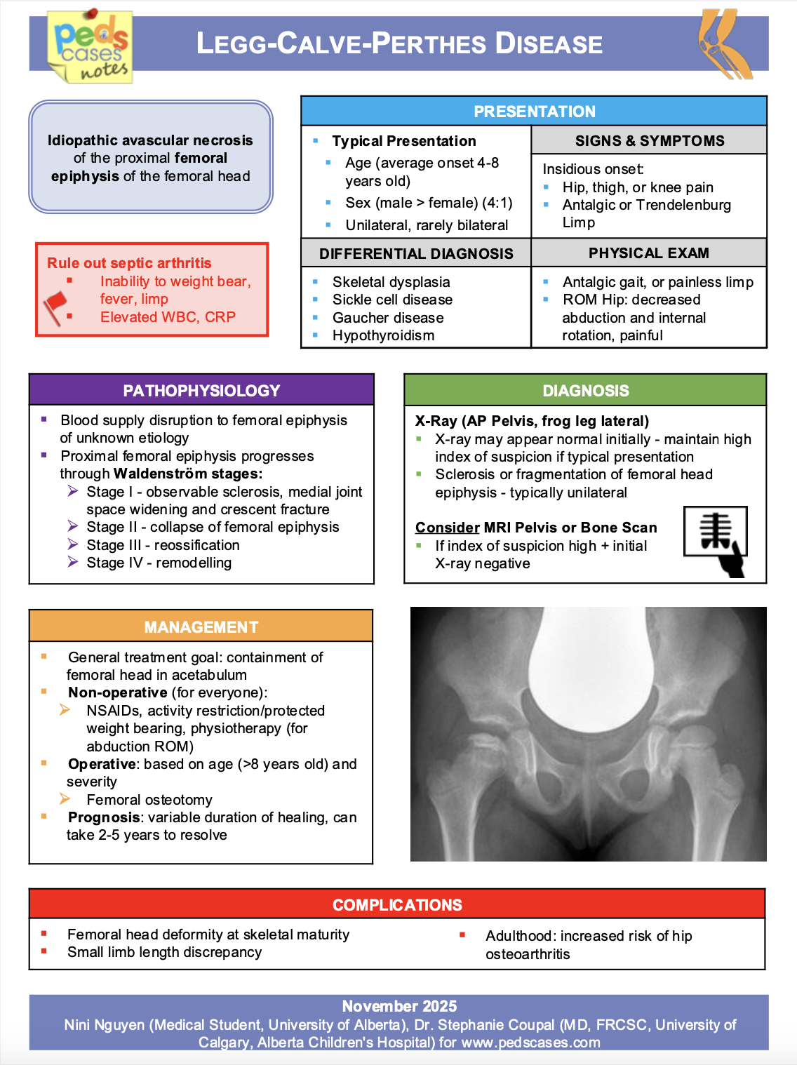 This PedsCases Note provides a one-page infographic on Legg-Calve-Perthes Disease. It was created by Nini Nguyen (Medical Student, University of Alberta) with the help of Dr. Stephanie Coupal (MD, FRCSC, University of Calgary, Alberta Children's Hospital).