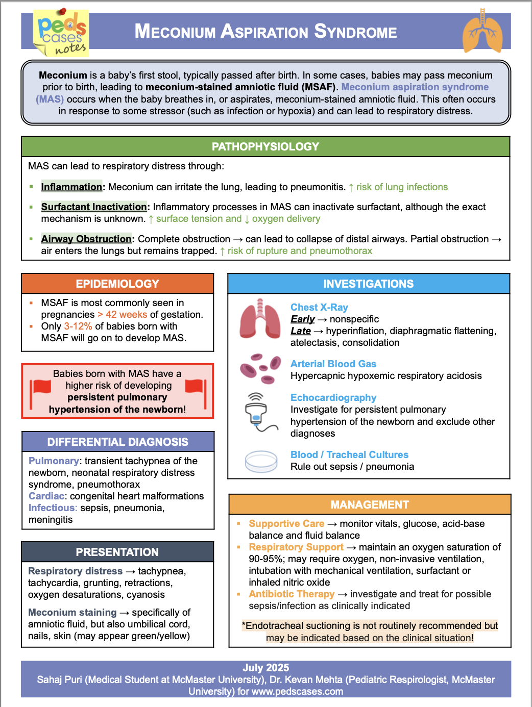 This PedsCases Note provides a one-page infographic on Meconium Aspiration Syndrome. Meconium aspiration syndrome (MAS) occurs when the baby breathes in, or aspirates, meconium-stained amniotic fluid. It was created by Sahaj Puri with the help of Dr. Kevan Mehta.