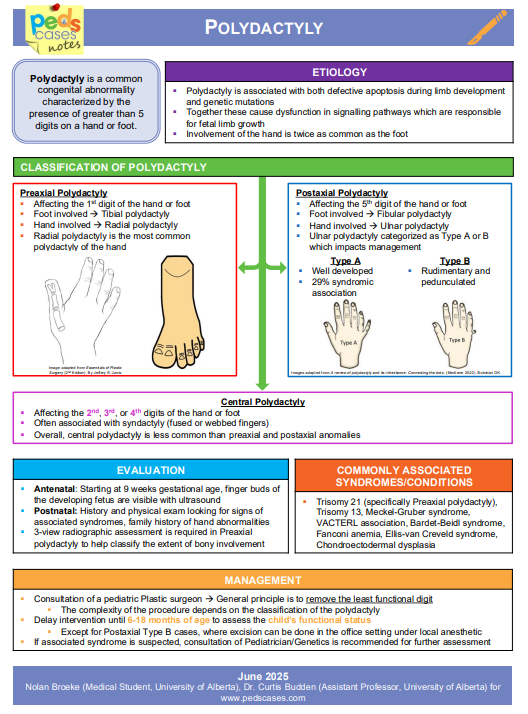 This PedsCases Note provides a one-page infographic on Polydactyly which is a common congenital abnormality characterized by the presence of greater than 5 digits on a hand or foot. It was created by Nolan Broeke ad Medical Student from the University of Alberta with the help of Dr. Curtis Budden Assistant Professor at the University of Alberta