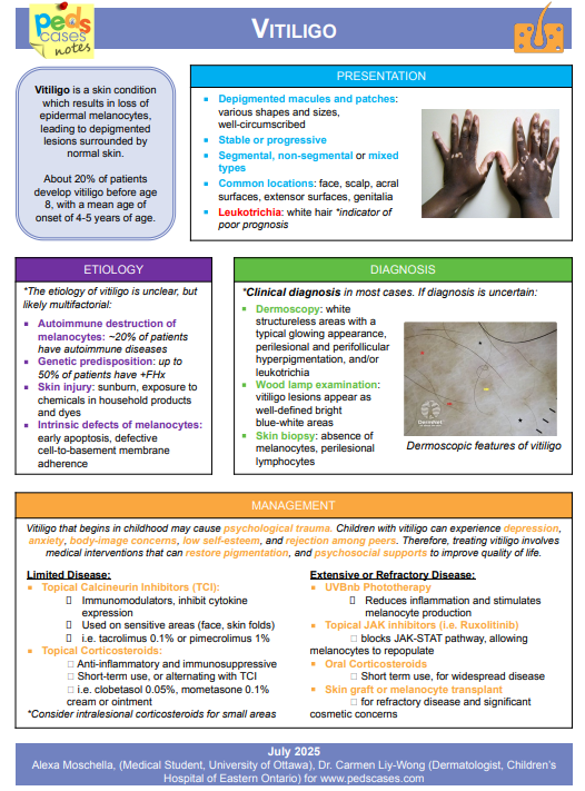 This PedsCases Note provides a one-page infographic on Vitiligo which is a skin condition which results in loss of epidermal melanocytes, leading to depigmented lesions surrounded by normal skin. It was created by Alexa Moschella, (Medical Student, University of Ottawa) with the help of Dr. Carmen Liy-Wong (Dermatologist, Children’s Hospital of Eastern Ontario)