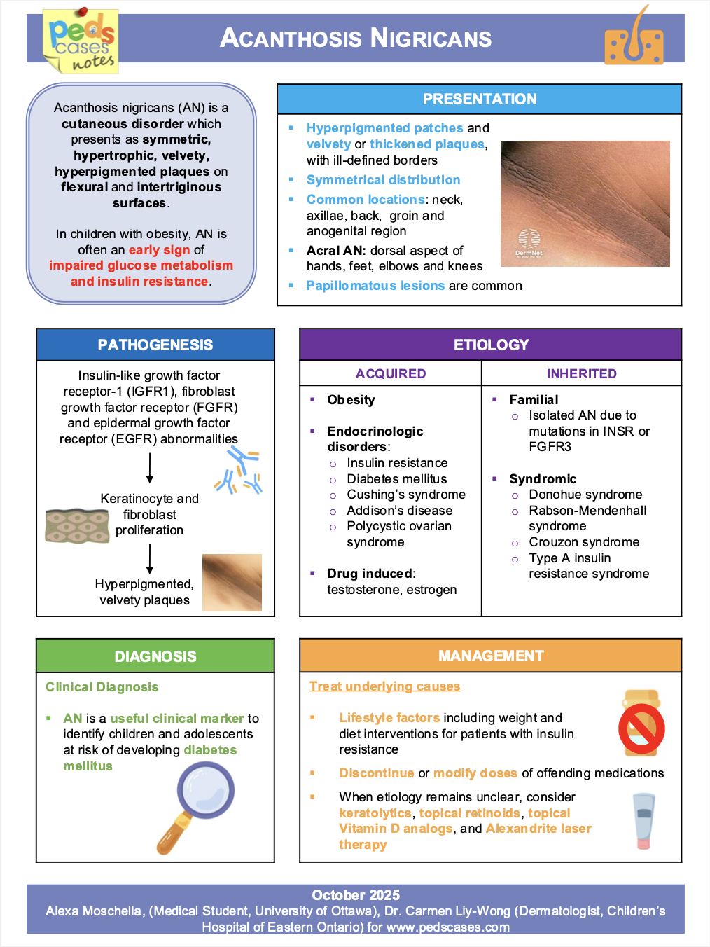 This PedsCases Note provides a one-page infographic on Acanthosis Nigricans. It was created by Alexa Moschella (Medical Student, University of Ottawa) with the help of Dr. Carmen Liy-Wong (Dermatologist, Children's Hospital of Eastern Ontario).