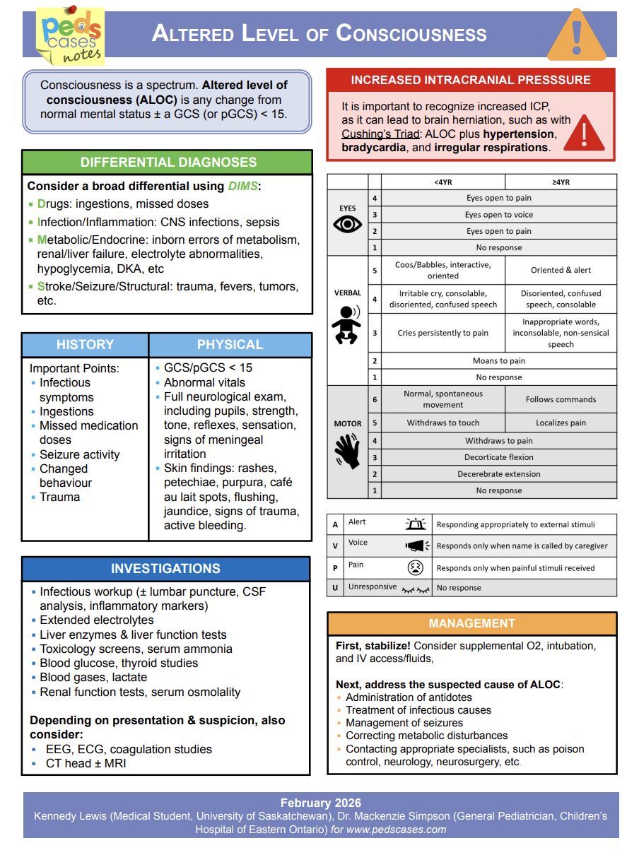 10. Lewis M, MacPherson P. Altered Level of Consciousness [podcast]. PedsCases; 2010 Aug 4 [cited 2025 Apr 14]. Available from: https://www.pedscases.com/altered-level-consciousness