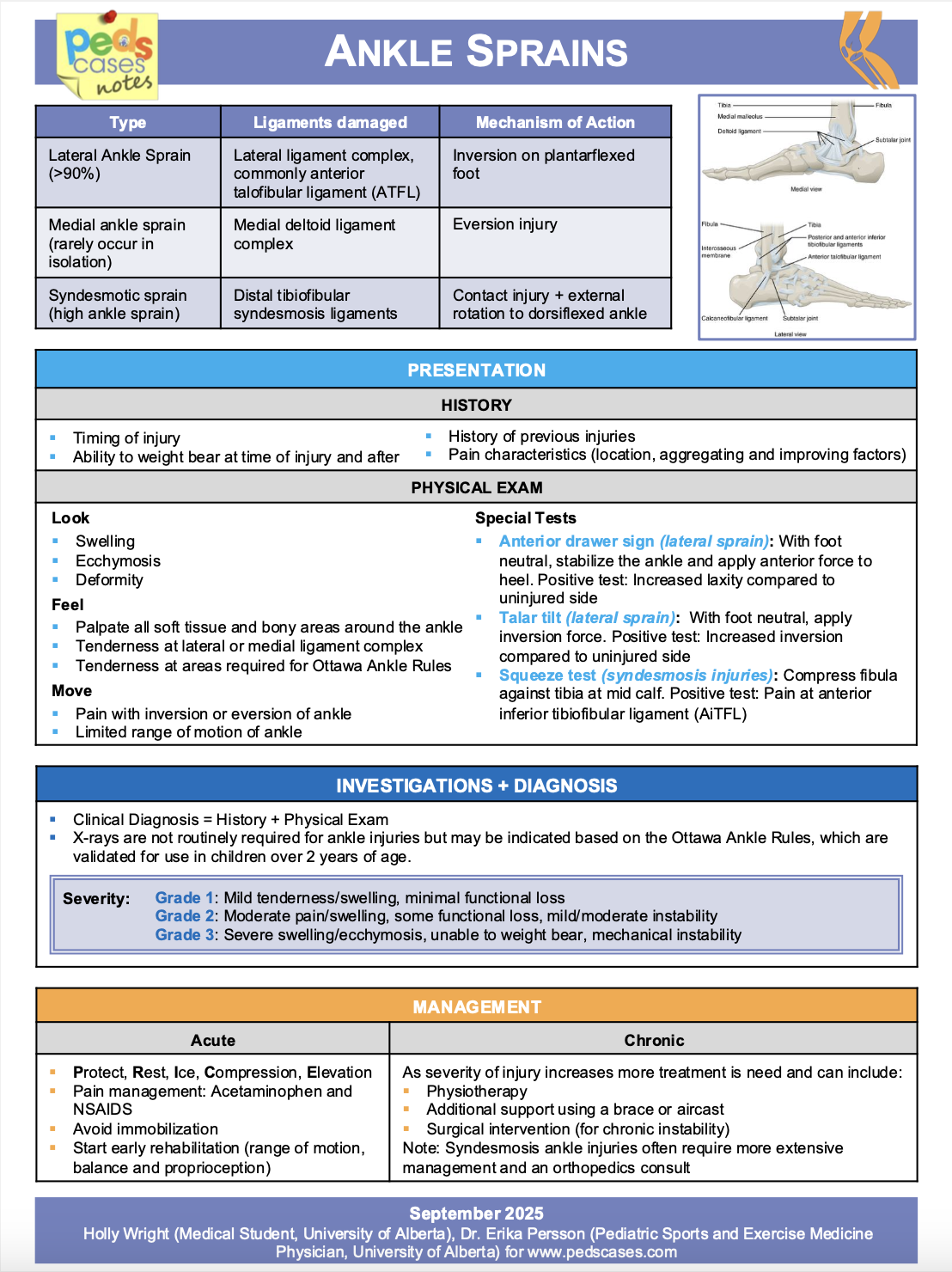 This PedsCases Note provides a one-page infographic on Ankle Sprains. It was created by Holly Wright (Medical Student, University of Alberta) with the help of Dr. Erika Persson (Pediatric Sports and Exercise Medicine Physician, University of Alberta).
