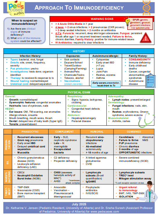This PedsCases Note provides a one-page infographic on the Approach to Immunodeficiency including common and red flag symptoms. It was created by Dr. Katharine V. Jensen (Pediatric Resident, University of Alberta) and Dr. Sneha Suresh (Assistant Professor of Pediatrics, University of Alberta)
