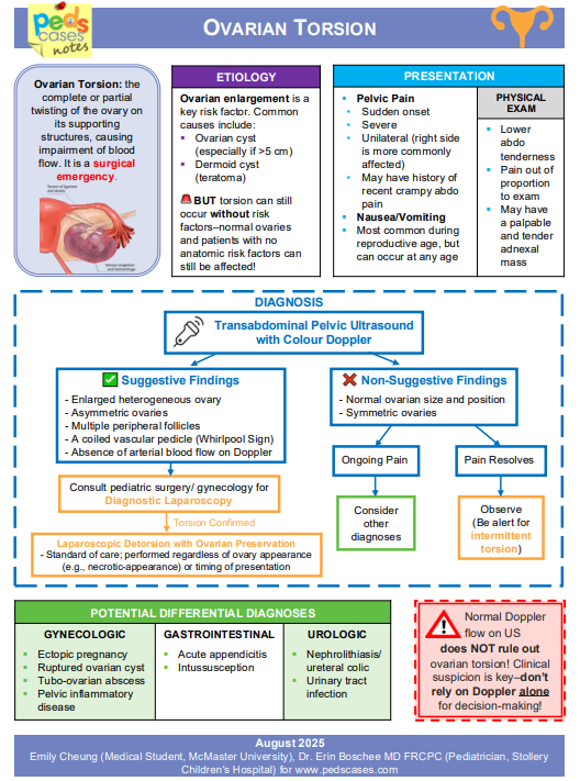 This PedsCases Note provides a one-page infographic on Ovarian Torsion. Ovarian Torsion: the complete or partial twisting of the ovary on its supporting structures, causing impairment of blood flow. It is a surgical emergency. It was created by Emily Cheung (Medical Student, McMaster University), Dr. Erin Boschee MD FRCPC (Pediatrician, Stollery Children's Hospital).