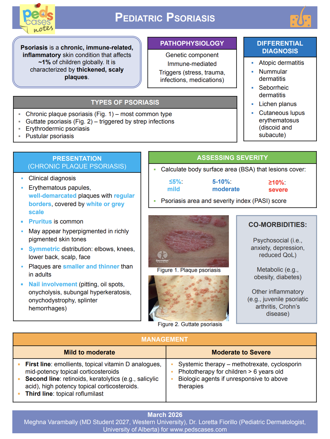 This PedsCases Note provides a one-page infographic on Pediatric Psoriasis. Psoriasis is a chronic, immune-related, inflammatory skin condition that affects ~1% of children globally. It is characterized by thickened, scaly plaques. It was created by Meghna Varambally (MD Student 2027, Western University) with the help of Dr. Loretta Fiorillo (Pediatric Dermatologist, University of Alberta).