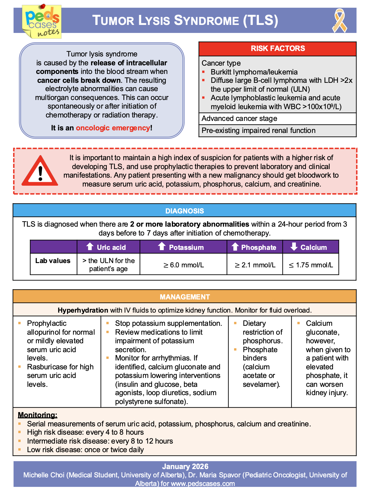 This PedsCases Note provides a one-page infographic on Tumor Lysis Syndrome (TLS). This is an oncologic emergency caused by the release of intracellular components when cancer cells break down. It was created by Michelle Choi (Medical Student, University of Alberta), with the help of Dr. Maria Spavor (Pediatric Oncologist, University of Alberta).